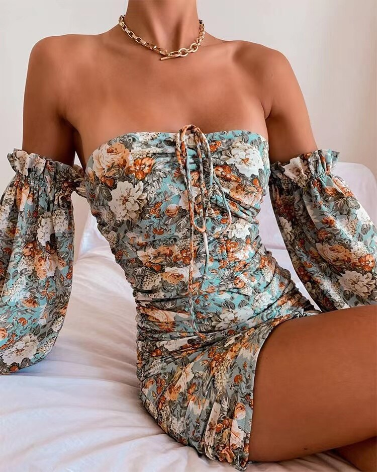 Sixsr Womens Fashion Floral Print Sexy Off Shoulder Women Dress Spring Autumn New Half Sleeve Skinny Ruched Mini Dresses Ladies Party Vestidos