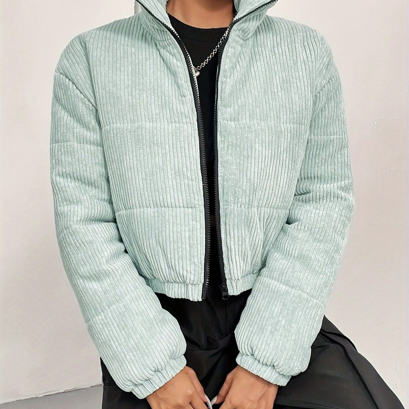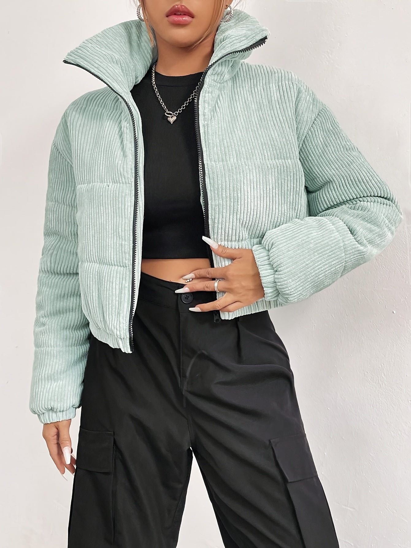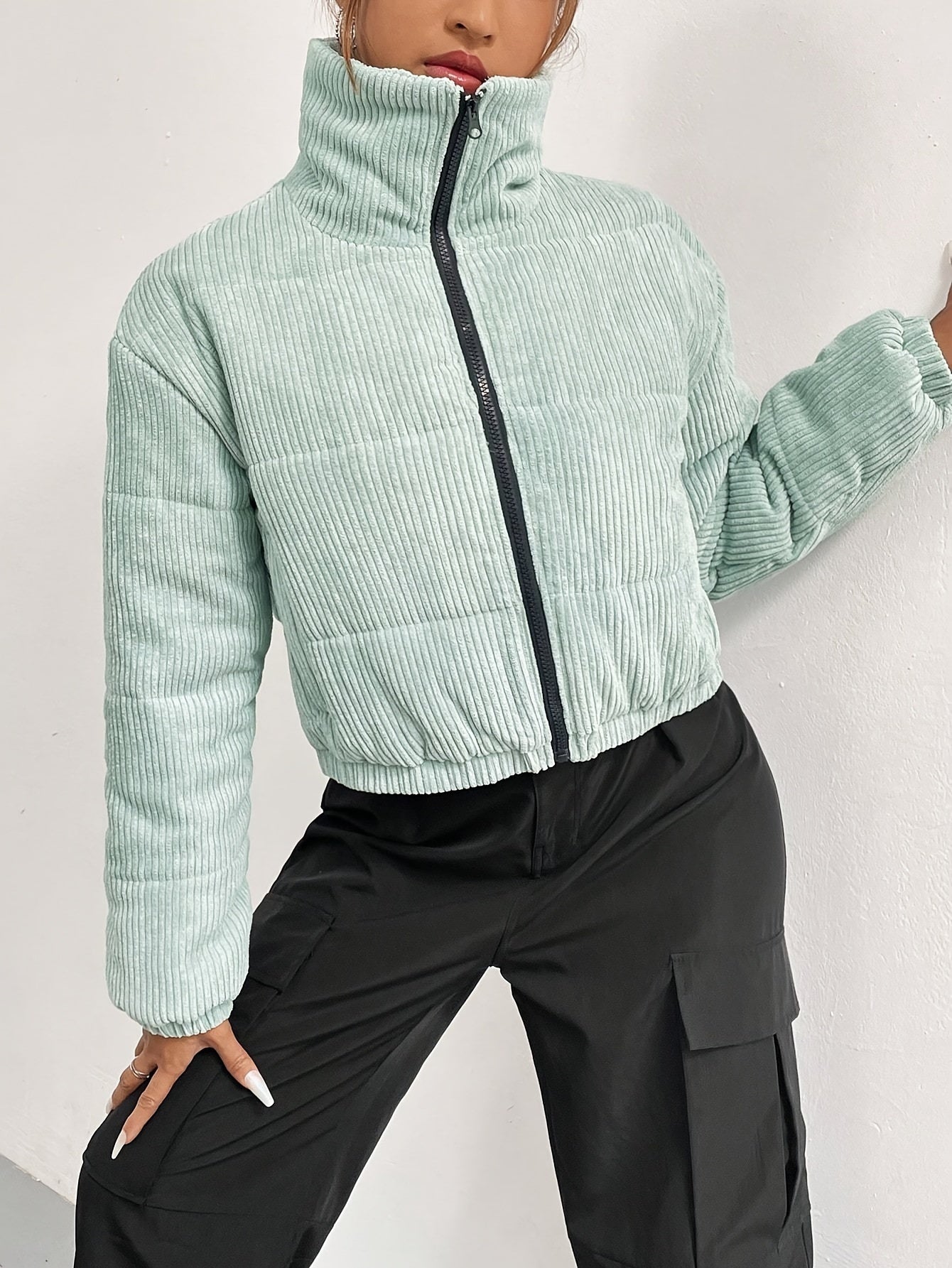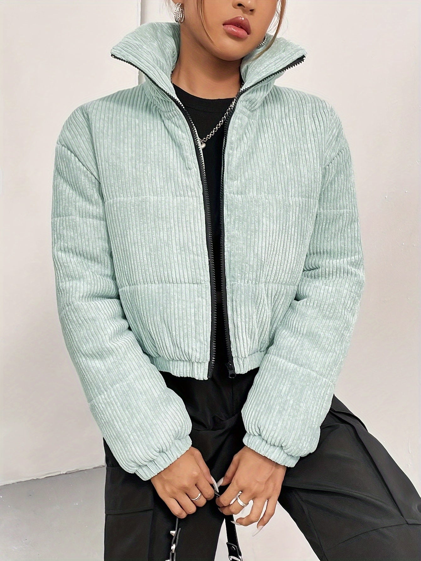 Sixsr Zip Front Stand Collar Coat, Casual Long Sleeve Winter Warm Outerwear, Women's Clothing