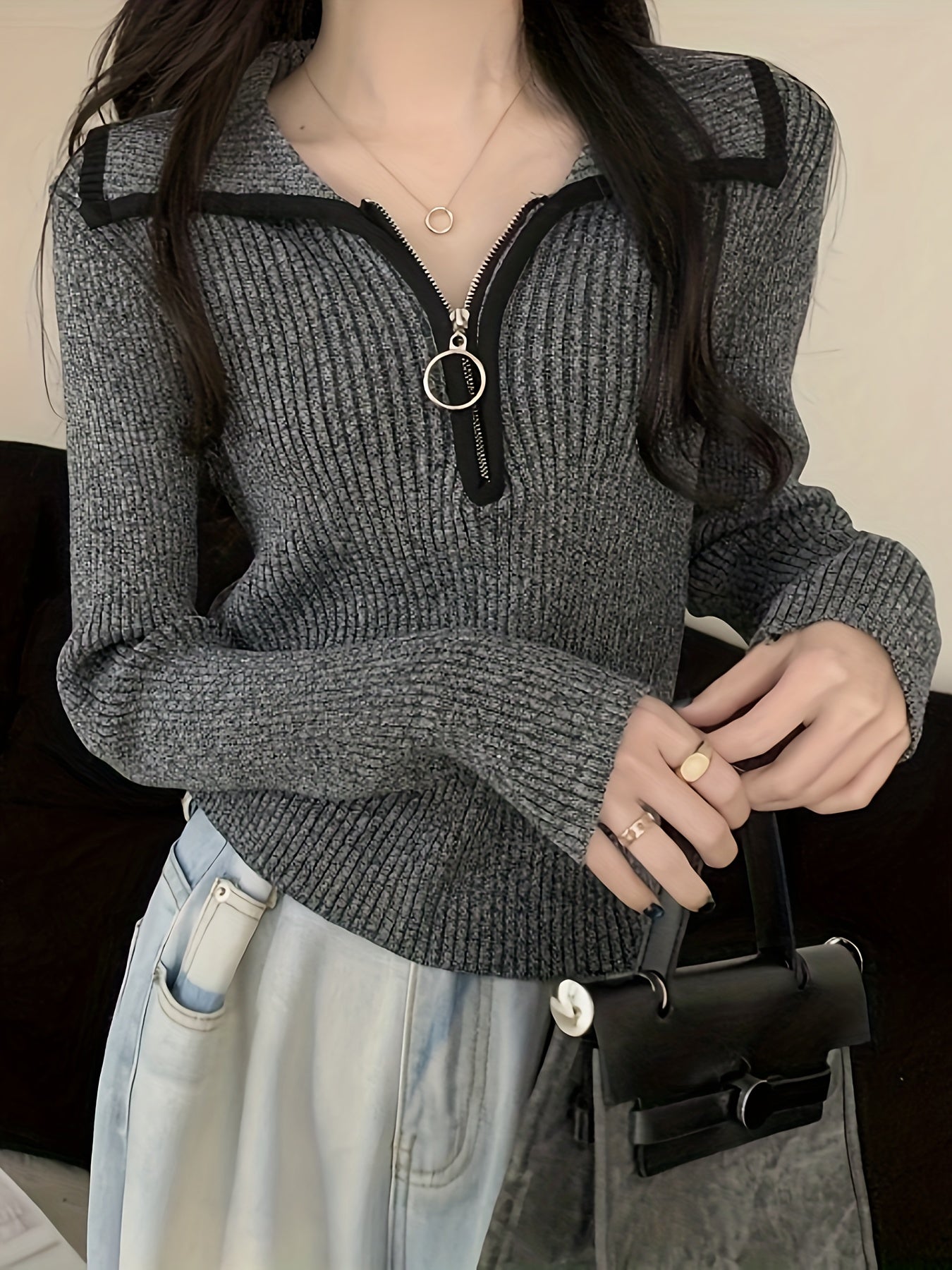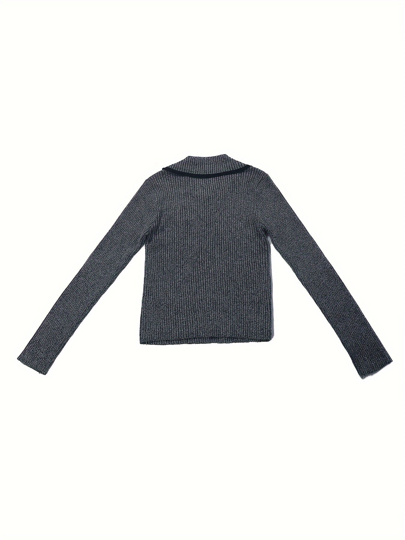 Sixsr Zip Turndown Collar Pullover Sweater, Casual Long Sleeve Slim Sweater, Women's Clothing