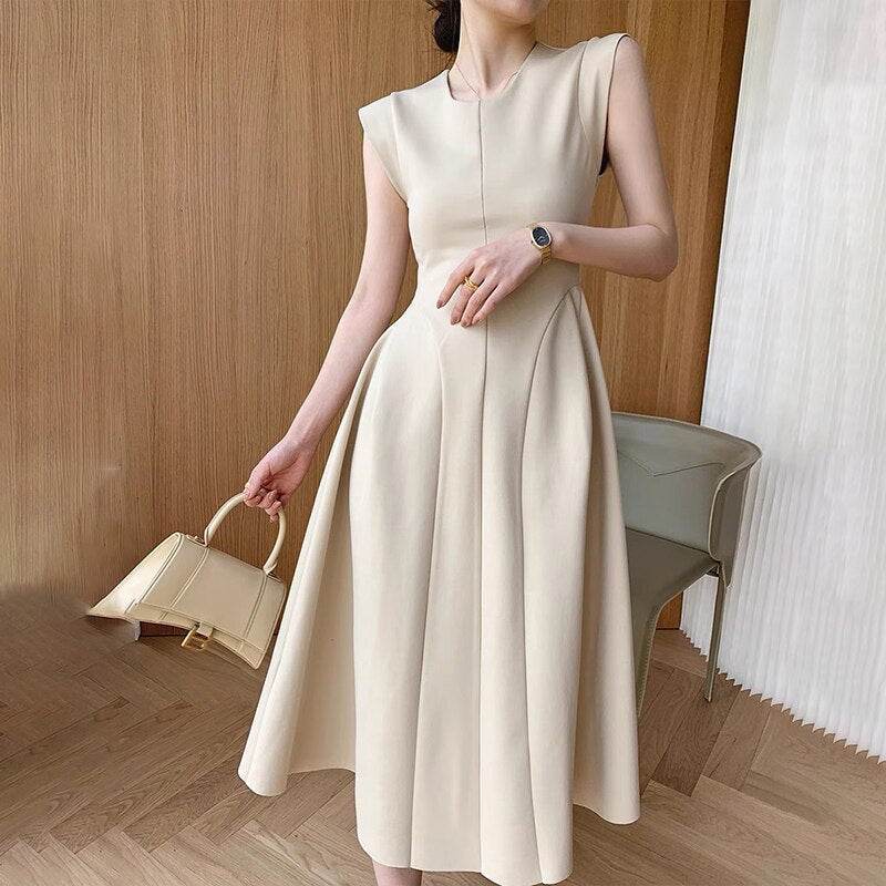 Sleeveless Summer Party Dress Women O-Neck High Waist Long Midi Dress Elegant A-Line Cotton Office Lady Hepburn Korean