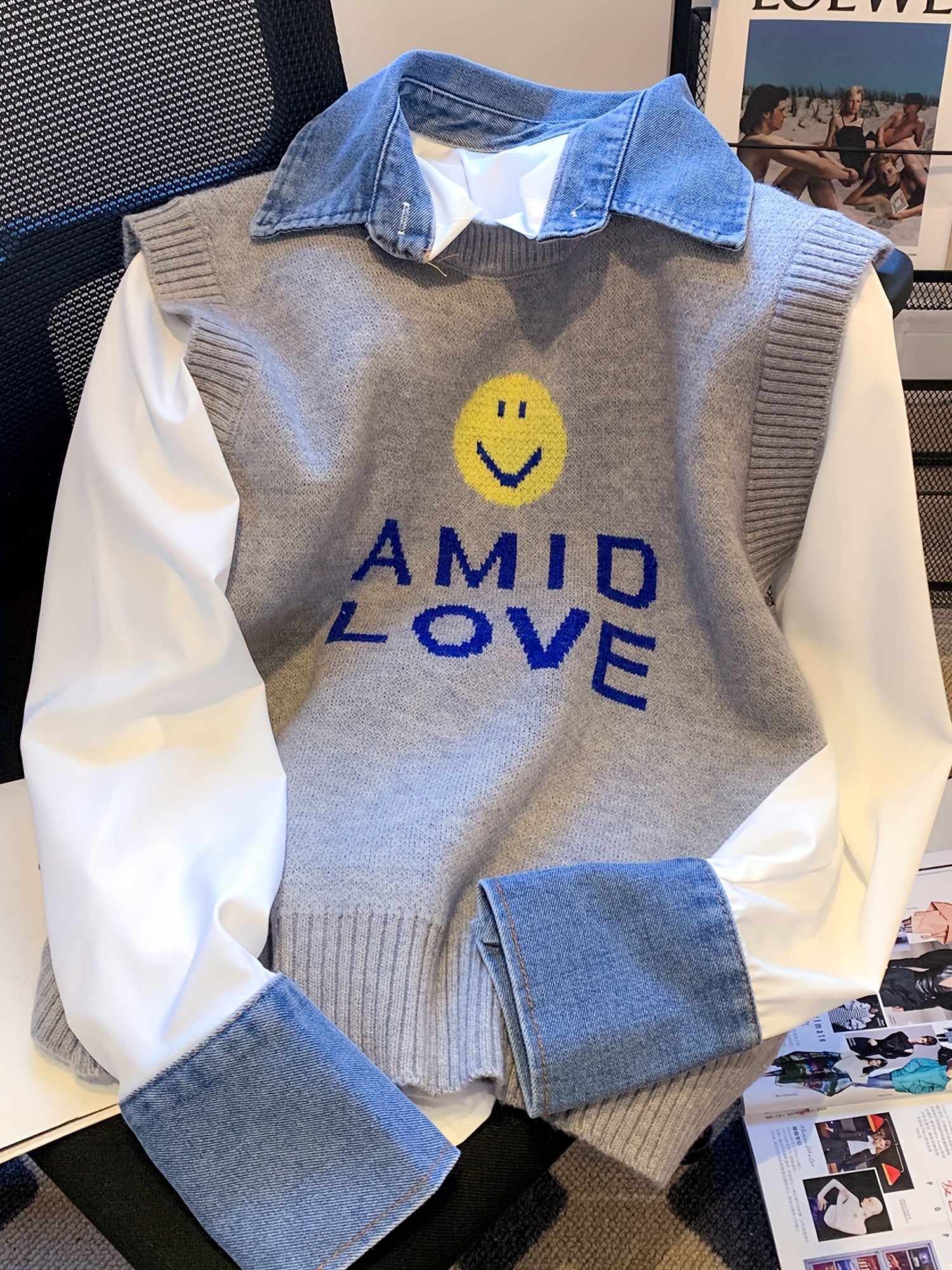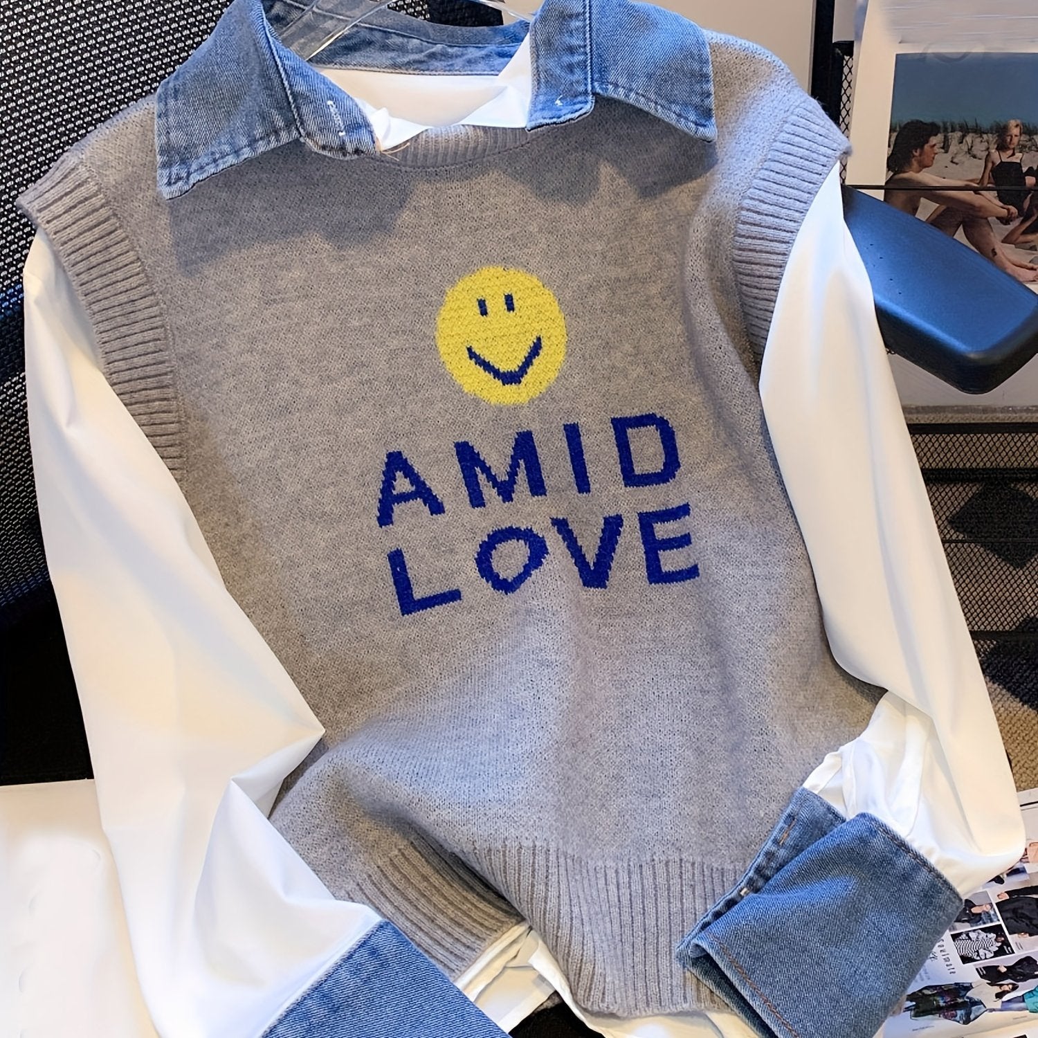 Smile Face & Letter Print Sweater Vest, Casual Sleeveless Vest For Fall & Winter, Women's Clothing