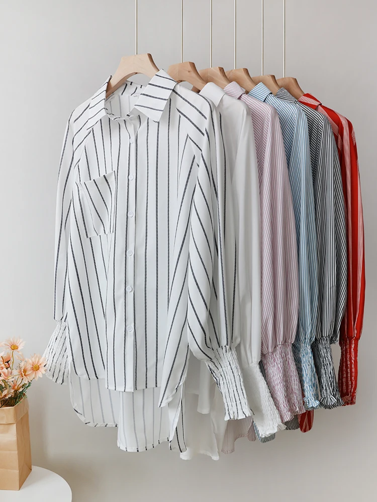 Spring Fall Lantern Sleeve Striped Shirt Blouse Women Lapel Buttons Loose Shawl Cover-Ups Elegant Beach Bikini Cover Up