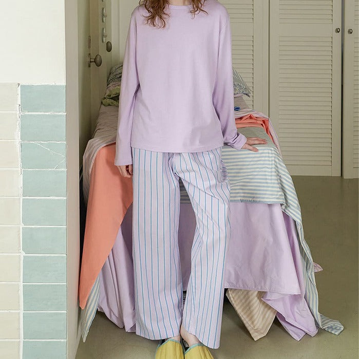 Spring loungewear two-piece set solid color round neck long-sleeved T-shirt + elastic waist striped trousers set women's clothing can be worn outside