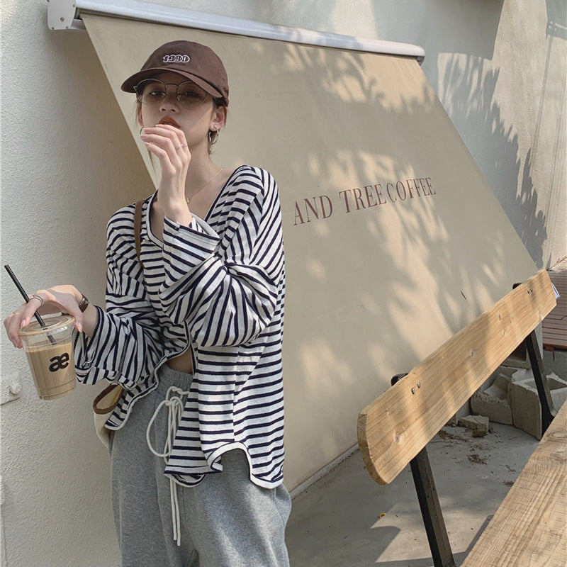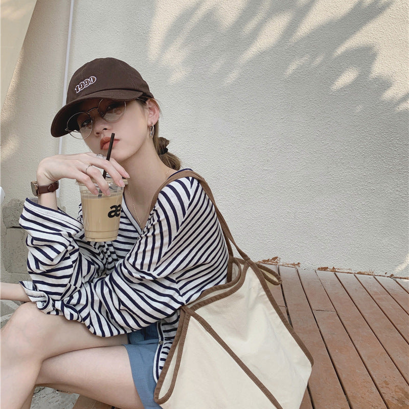 spring new striped knitted sweater, cotton and linen top v-neck air-conditioning sunscreen shirt versatile lazy long-sleeved cardigan