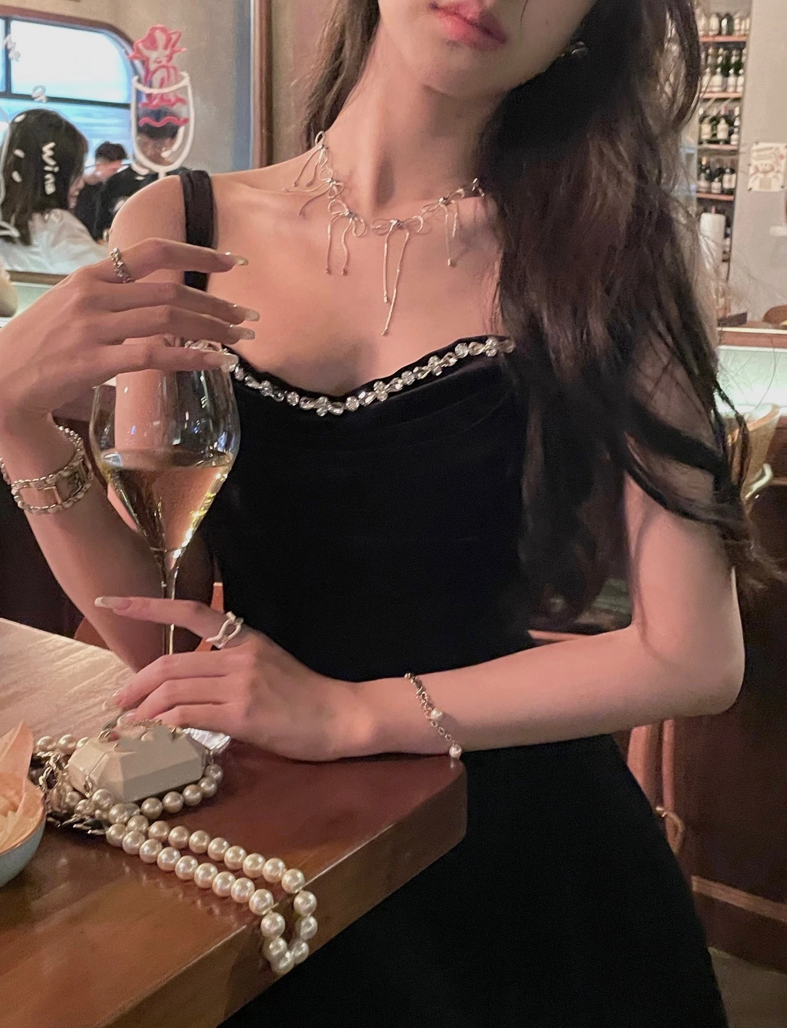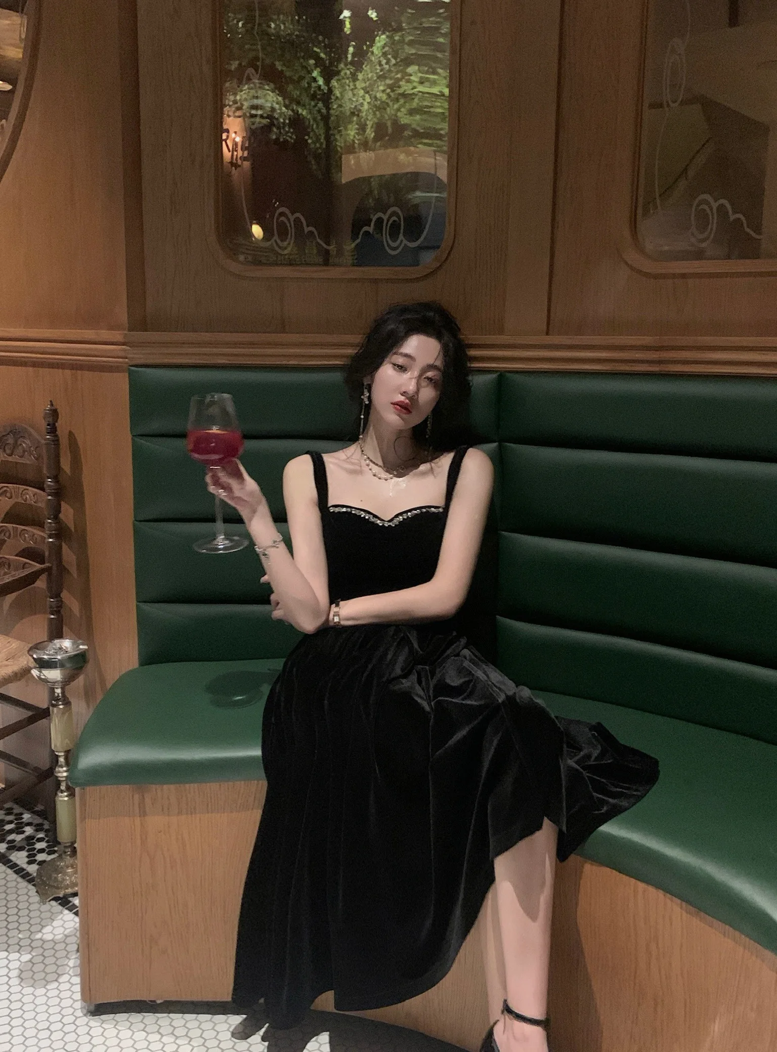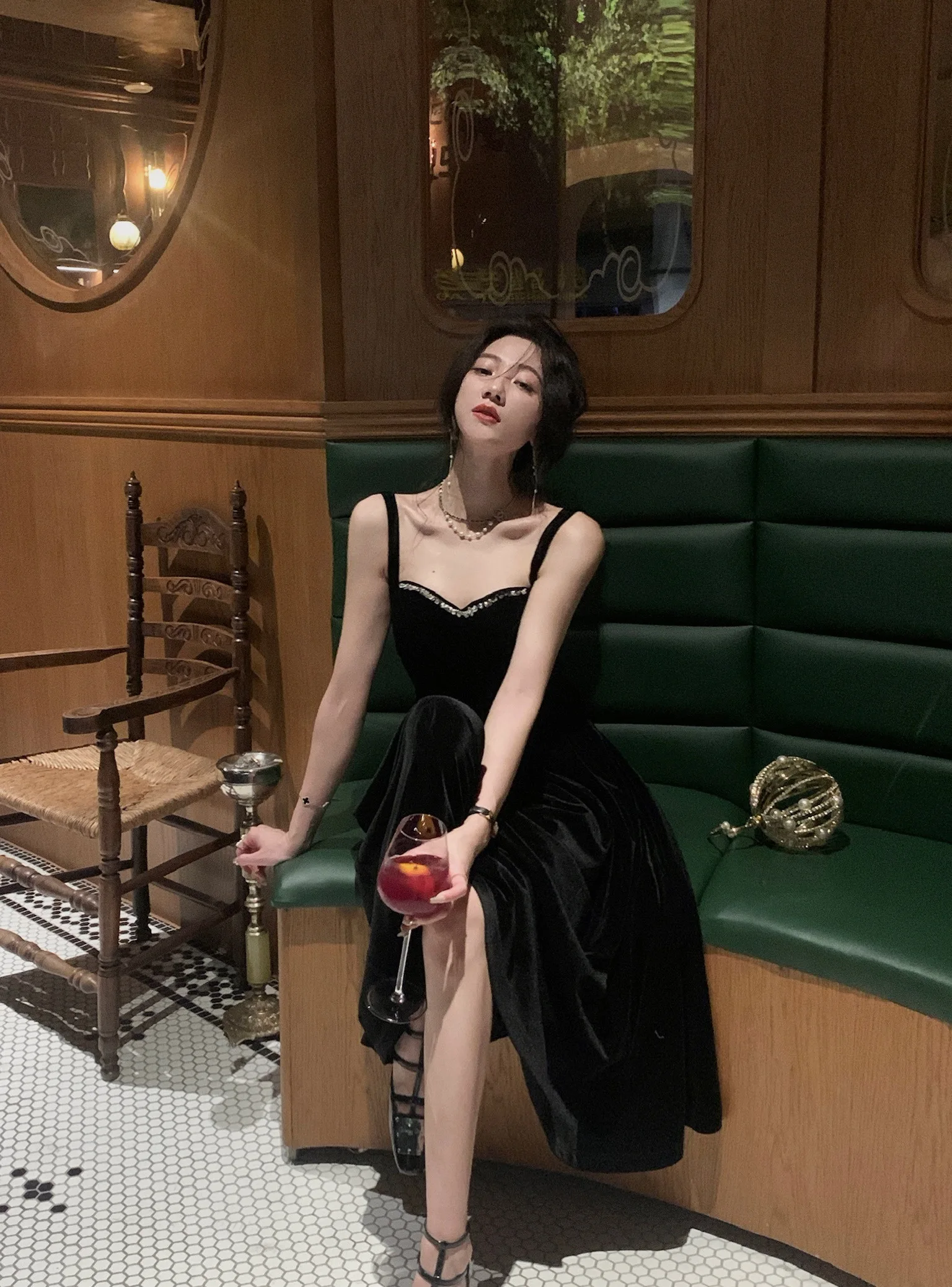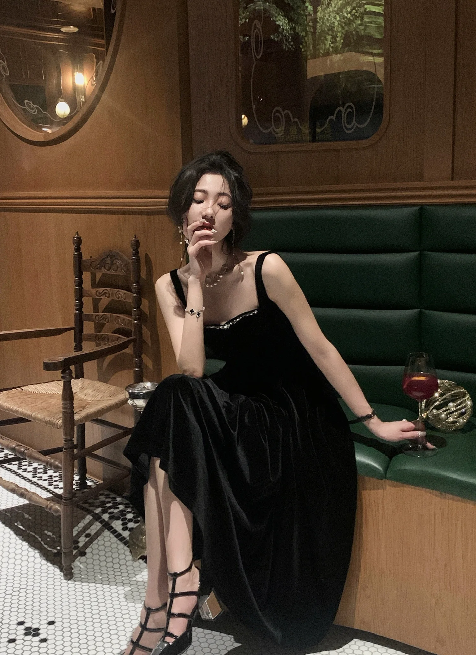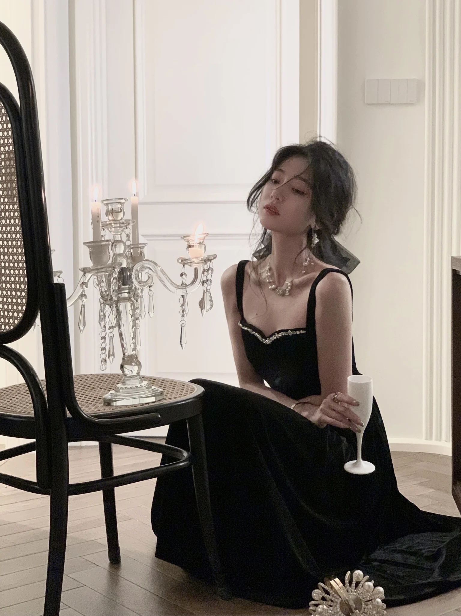 Summer New Elegant Spaghetti Strap Velvet Vintage Black Dress Women Sexy Prom Evening Party Fashion Clothing