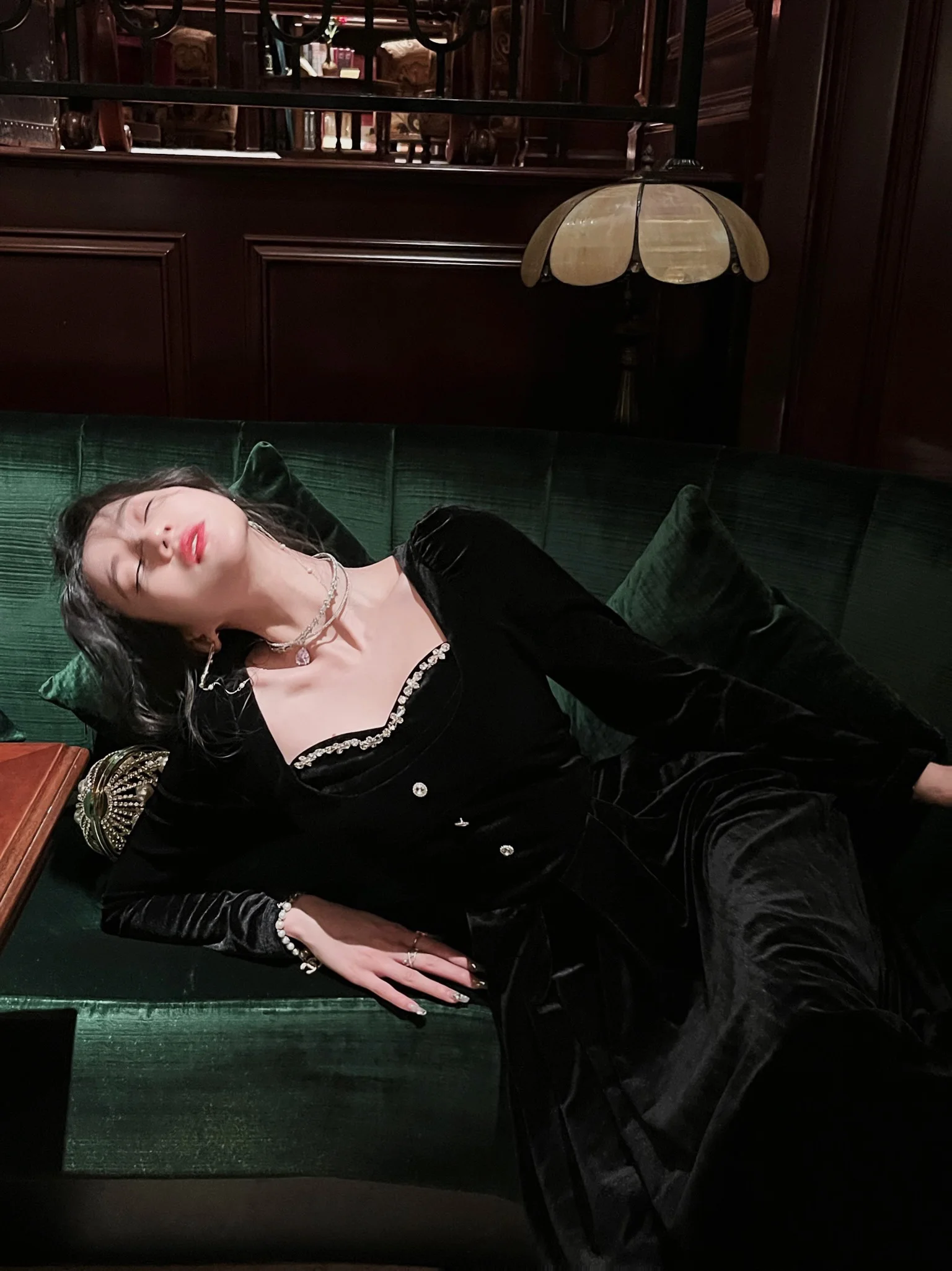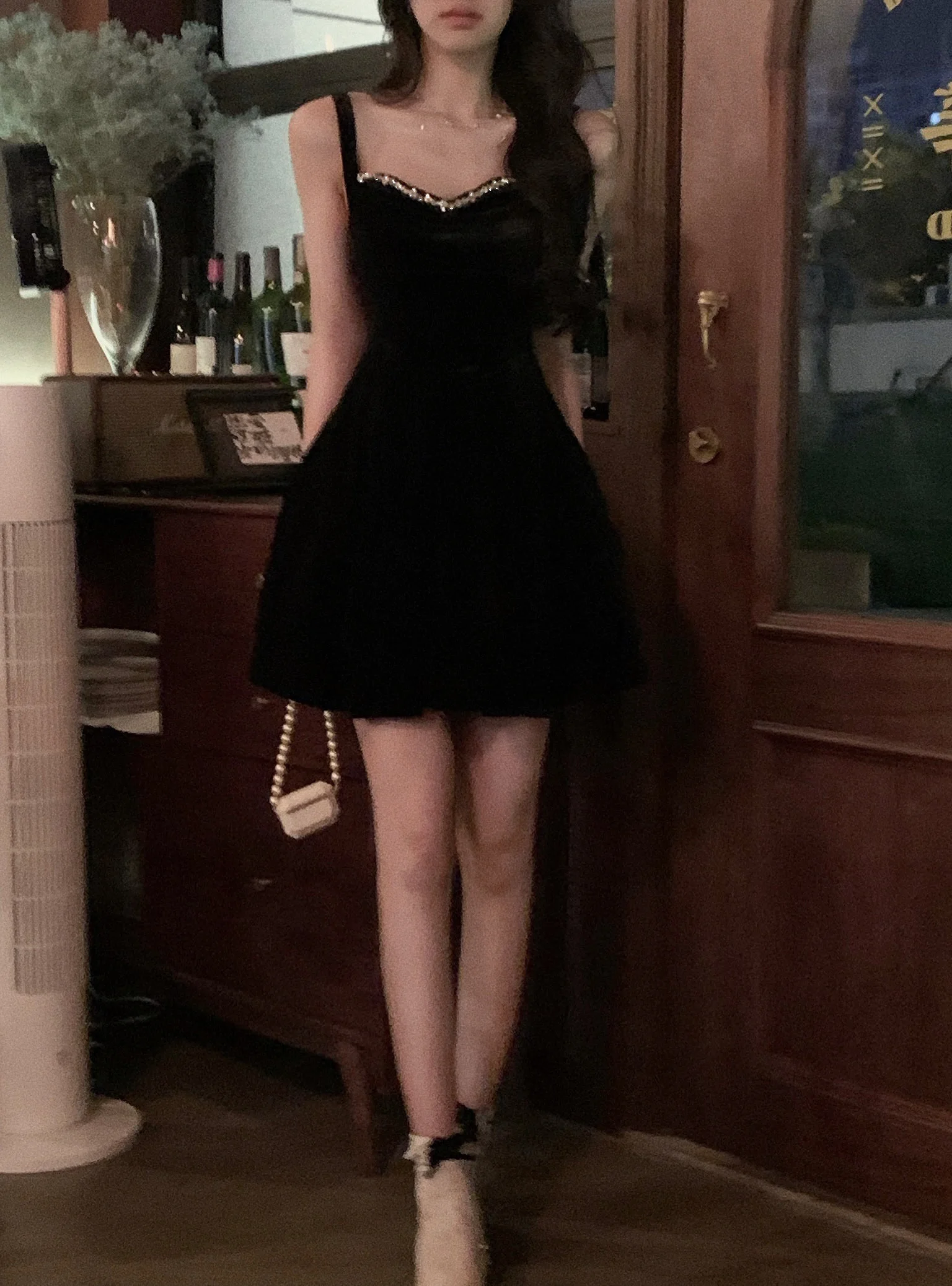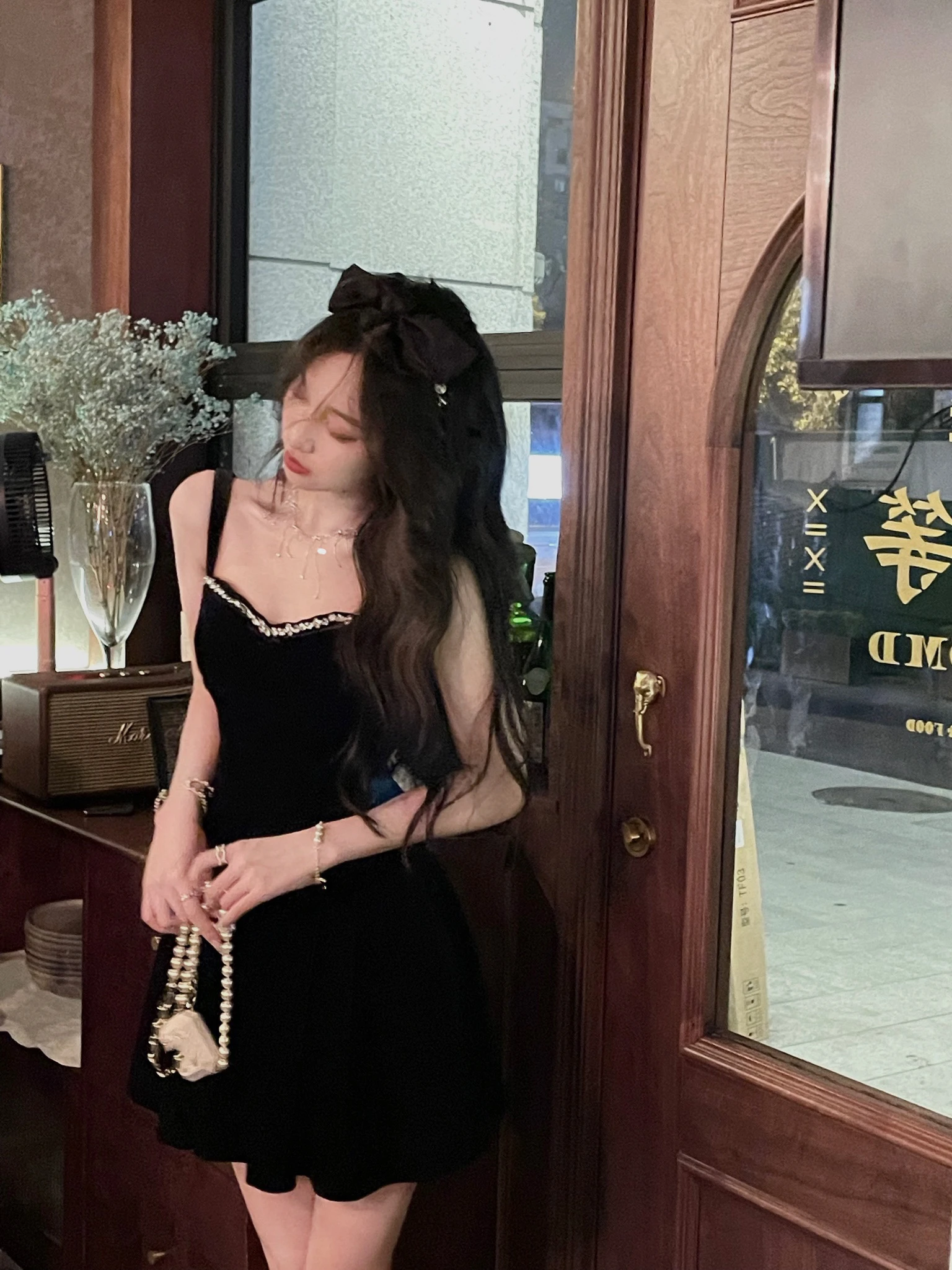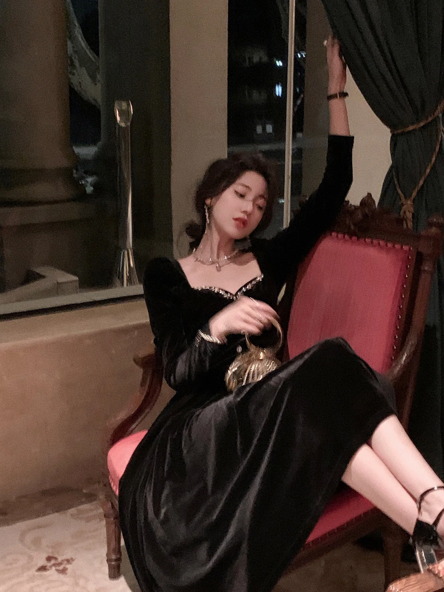 Summer New Elegant Spaghetti Strap Velvet Vintage Black Dress Women Sexy Prom Evening Party Fashion Clothing