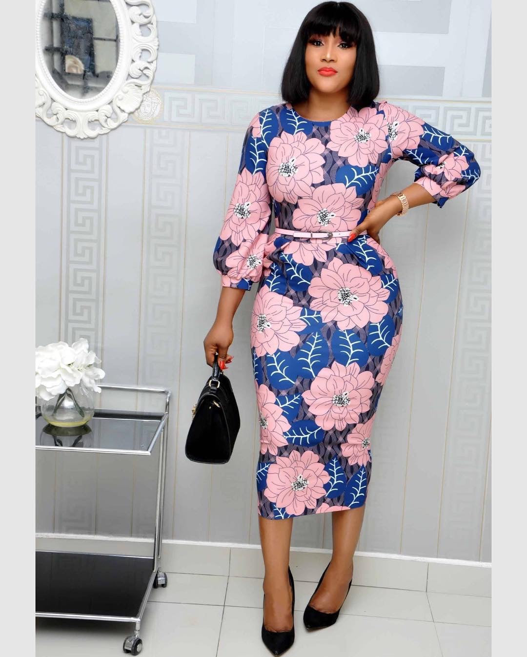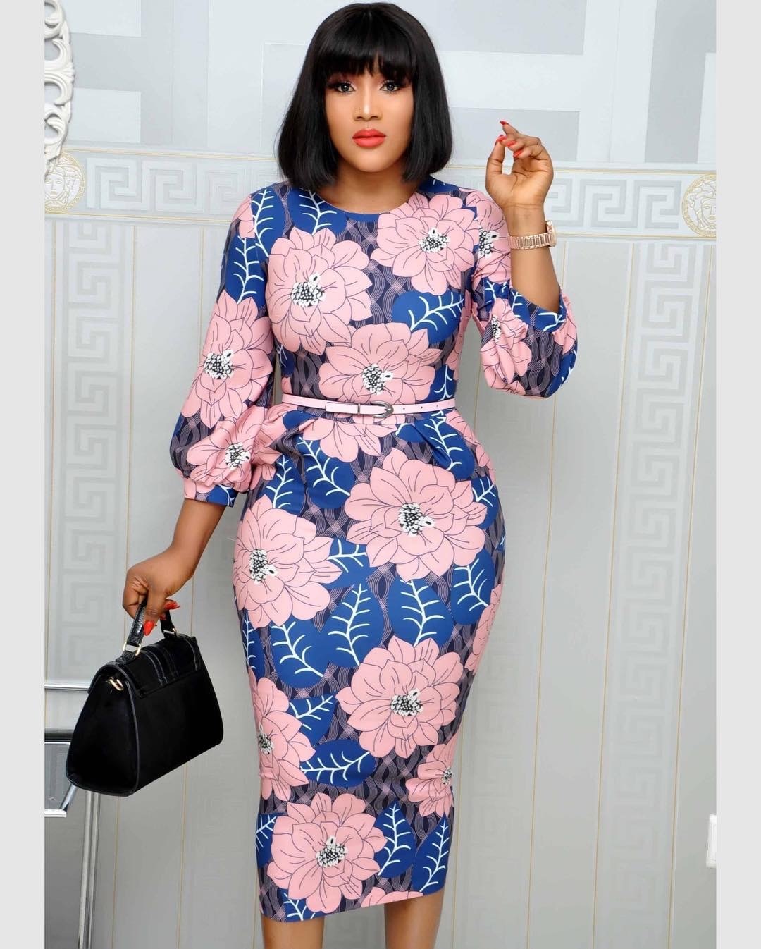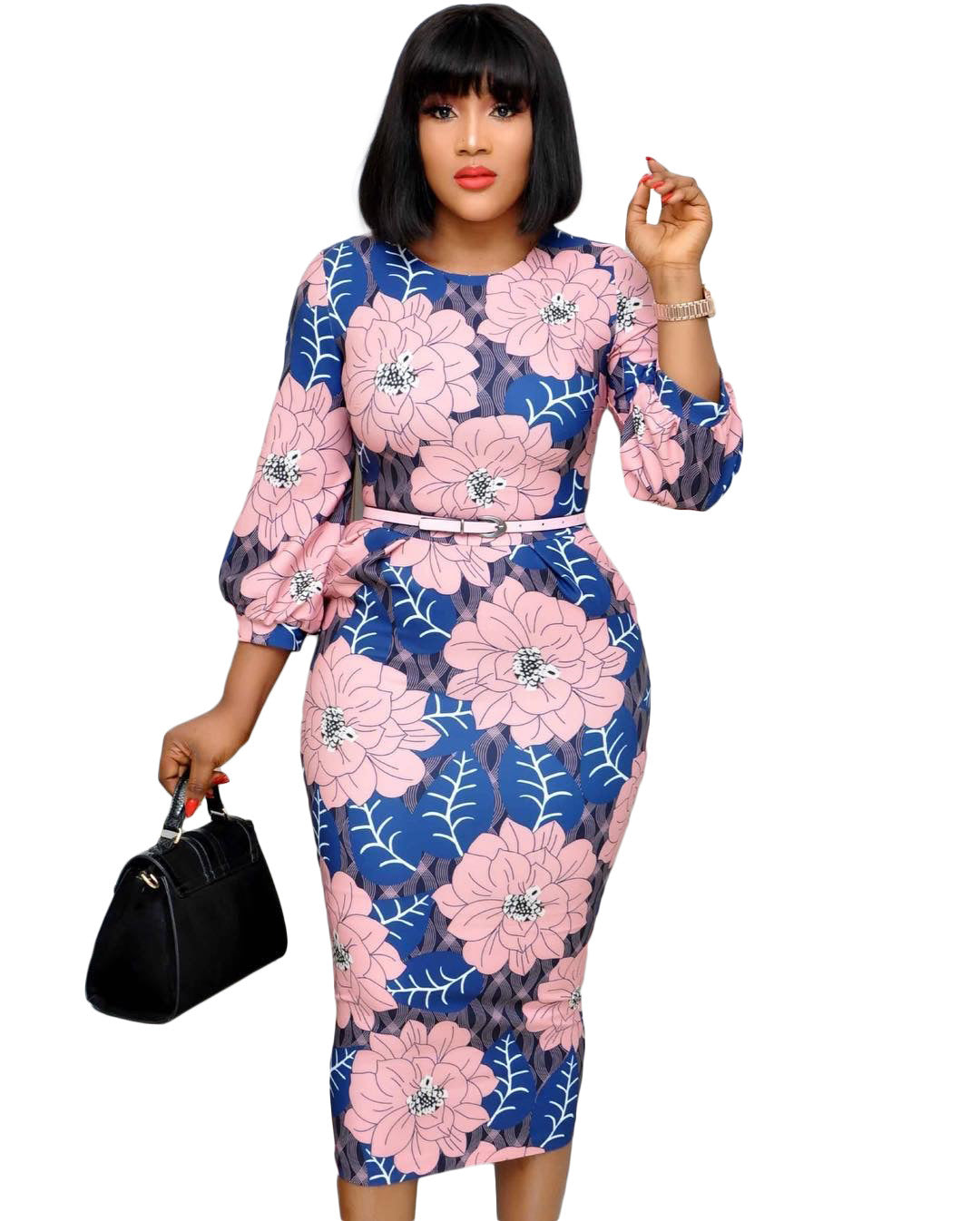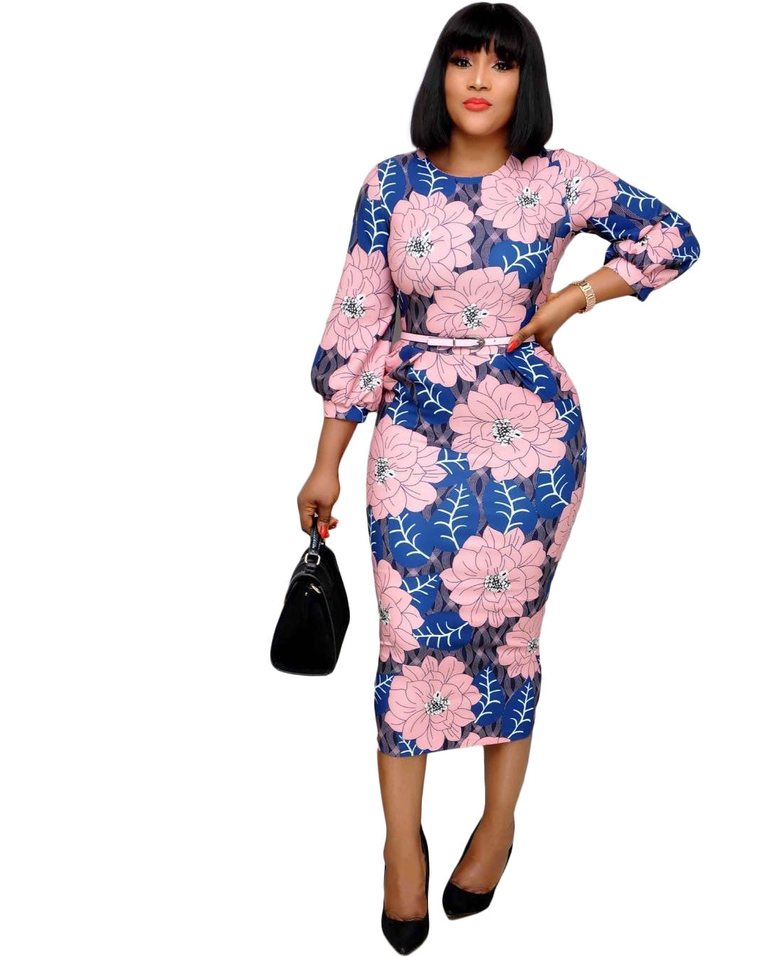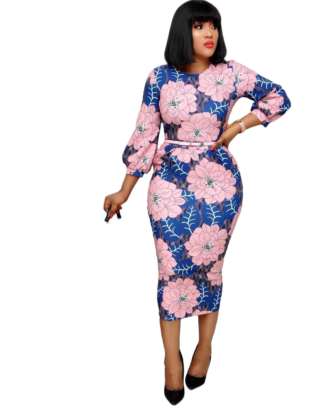 Sixsr Women Bodycon Printed Dress Three Quarter Sleeves Midi Office Ladies Work Wear Elegant Classy Vestidos African Female Plus Size