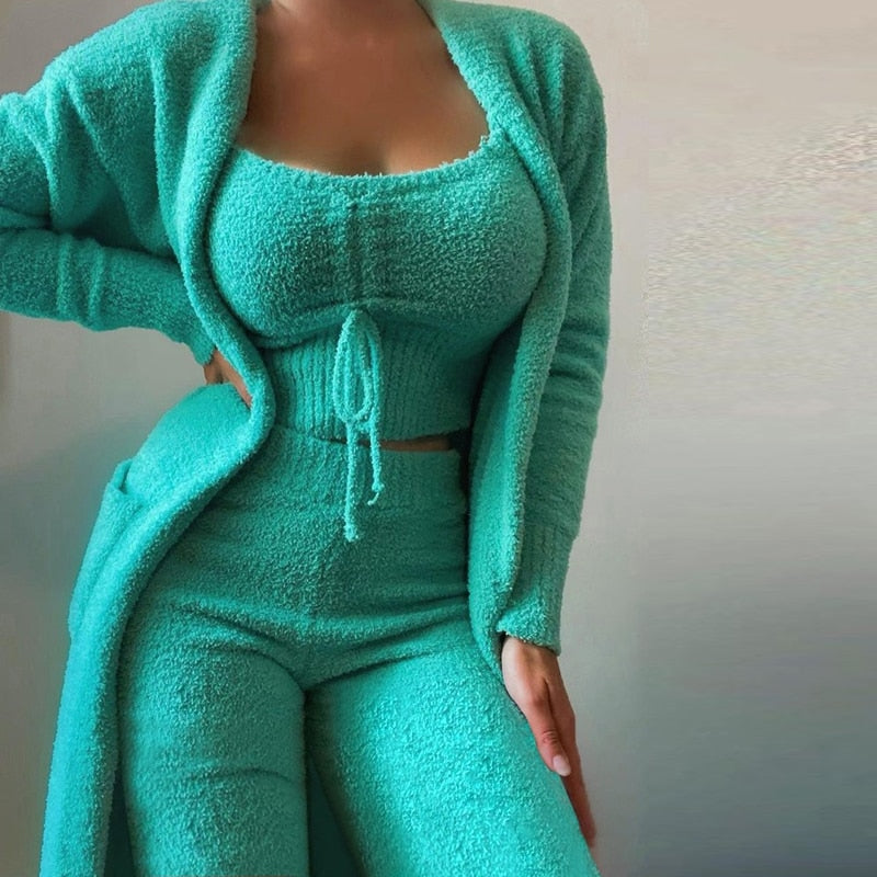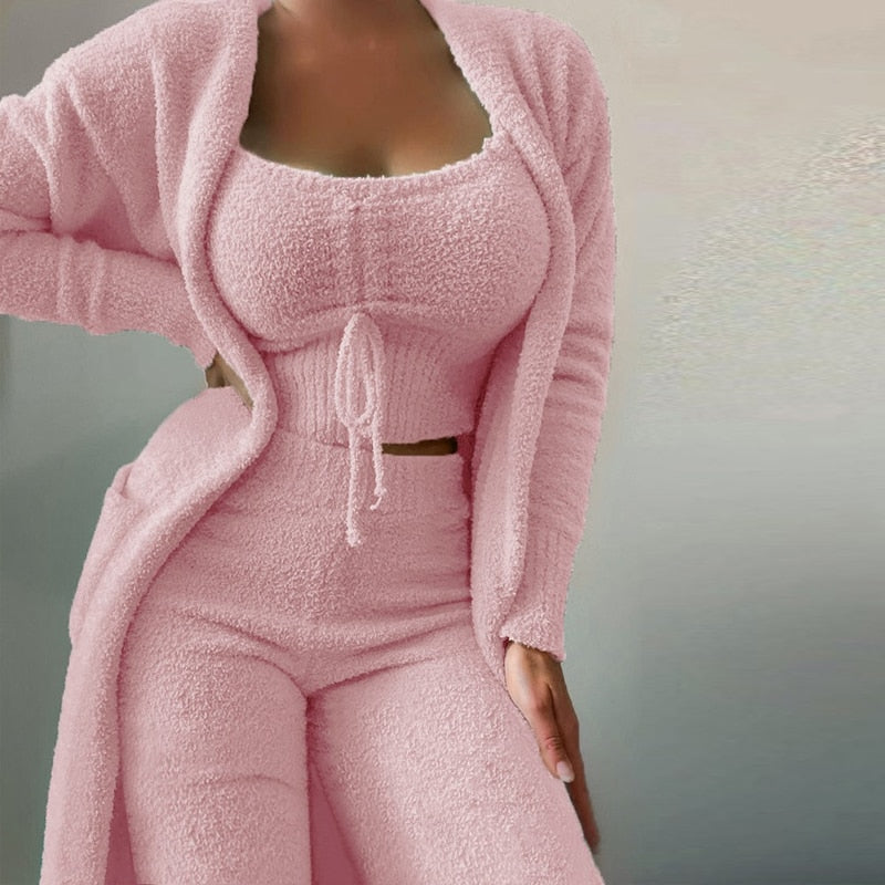 Women Elegant Fleece Soft 3 Piece Suit Fashion Square Collar Drawstring Tops+Long Cardigan Outfits Casual Pajamas Solid Set