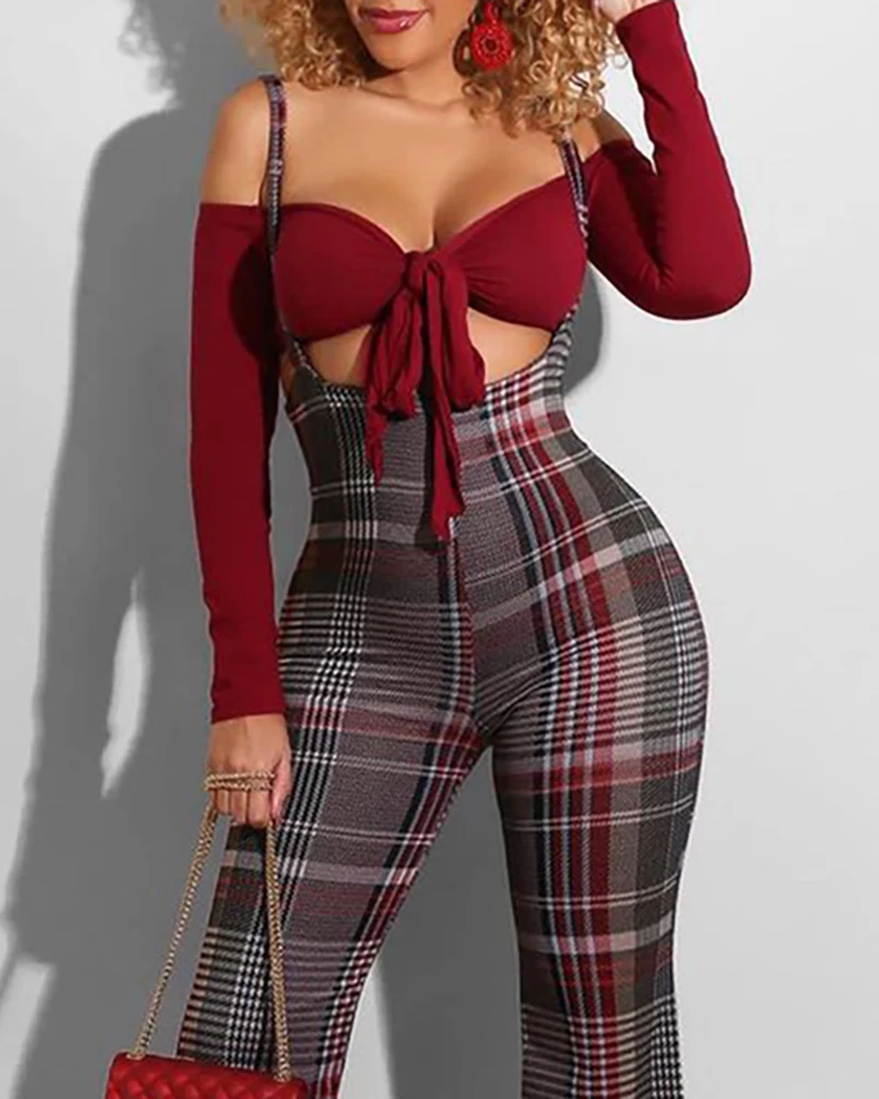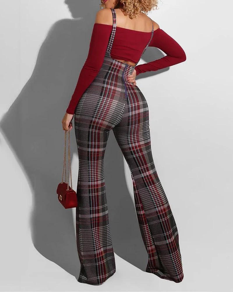 Women Fashion Elegant Casual Plaid Colorblock Suspender Pants