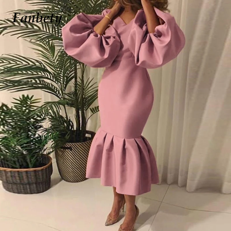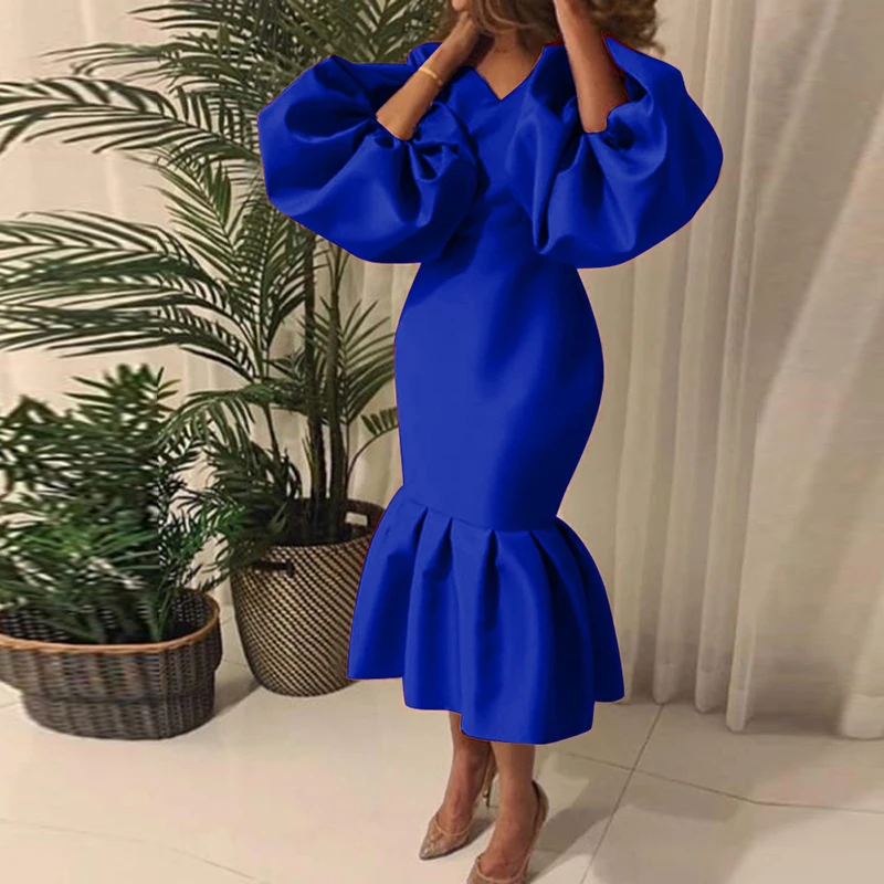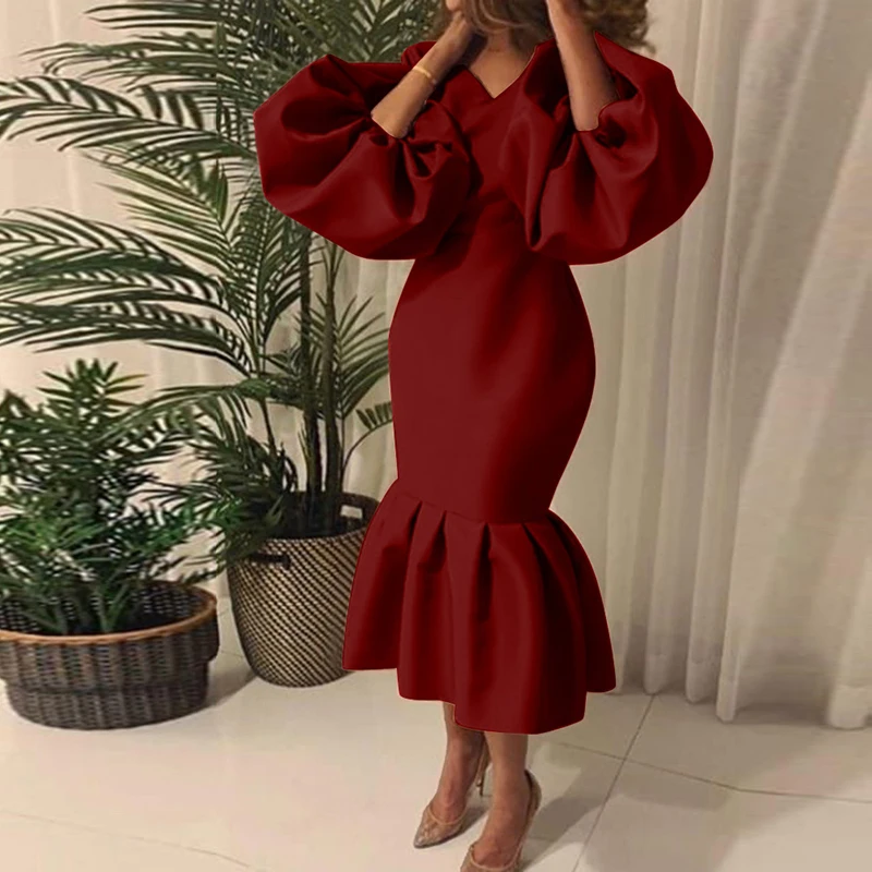 Sixsr Women Party Dress V Neck Long Puff Sleeves Bodycon Sexy Event Occasion African Female Fashion Autumn Spring Robes Vestidos New