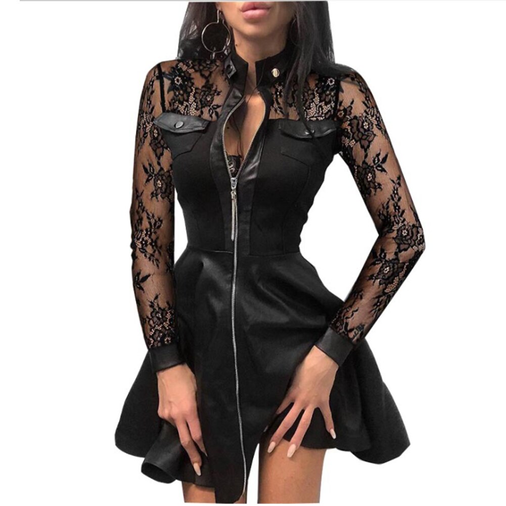 Sixsr Women Plus Size 5XL Summer Lace Sleeve PU Faux Leather Mini Dress V-Neck Zipper Party Dress Sexy Bodydon Dress