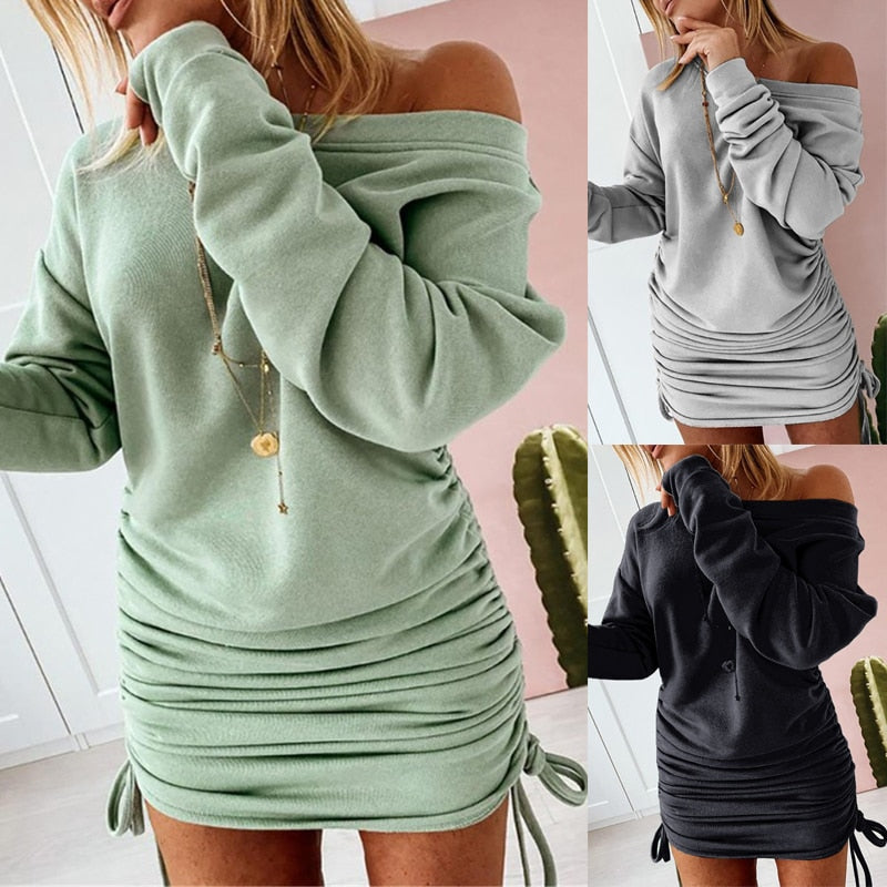 Sixsr Women Sexy Mini Dress Casual Ruffled Drawstring Solid Pencil Dress Autumn Long Sleeve Off Shoulder Pullovers Ladies Slim Dress