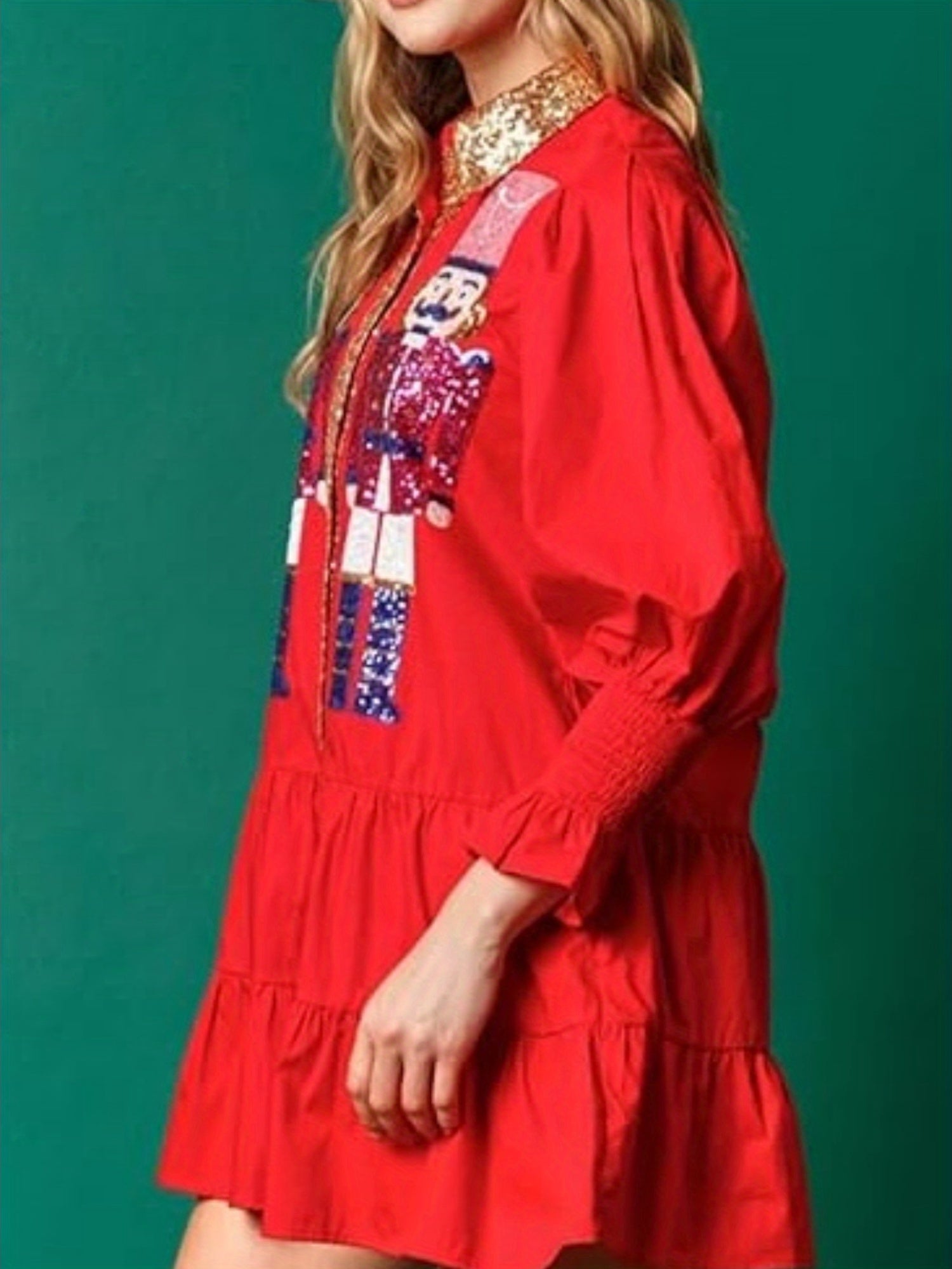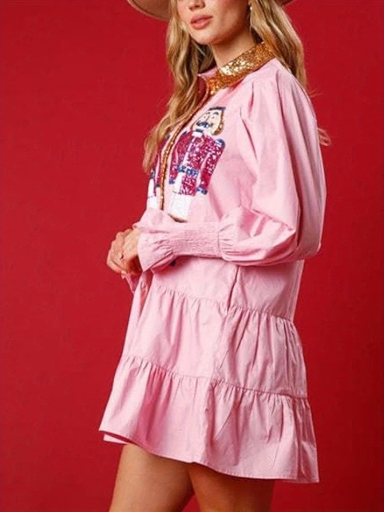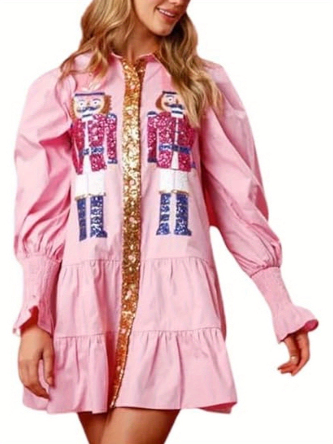 Women'S Polyester V-Neck Cartoon Nutcracker Sequin Dress, Fitted, Woven, Cute Style, for All Seasons